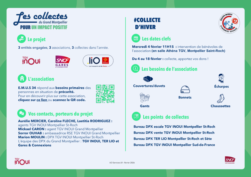 Cet hiver, les équipes TGV INOUI, TER LIO et Gares & Connexions du Grand Montpellier se mobilisent autour d’un projet solidaire concret : une collecte de dons au profit des personnes en situation de rue, en partenariat avec des associations locales, dont E.M.U.S 34.